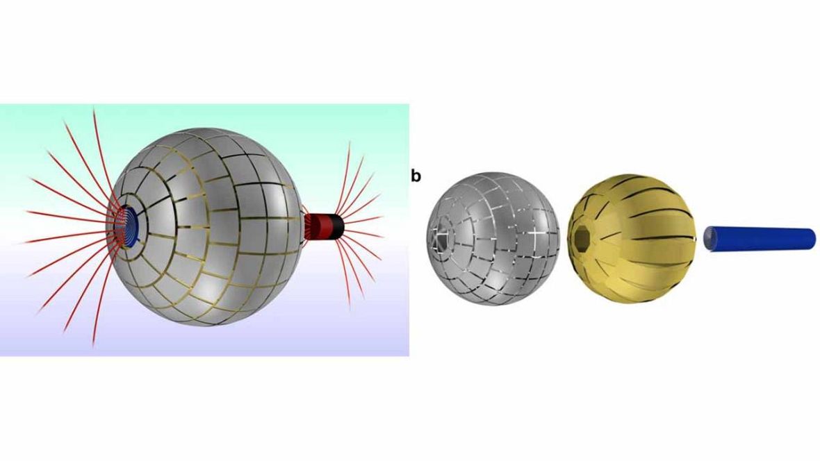 Así que el equipo diseñado un objeto de tres capas, que consta de dos esferas concéntricas con un cilindro de espiral interior. La capa interior transmite esencialmente un campo magnético de un extremo al otro, mientras que las otras dos capas actuaron para ocultar la existencia del campo.